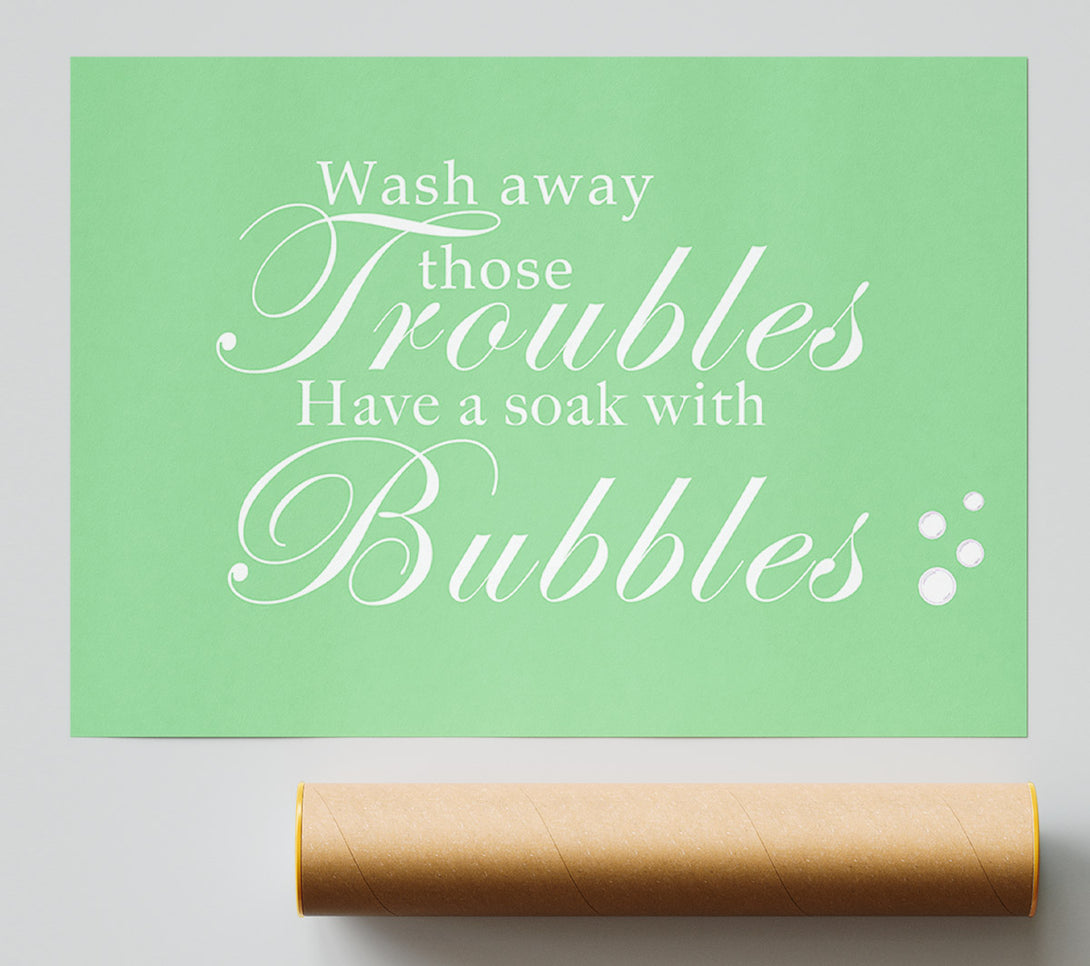 Our Bathroom Quote Wash Away Those Troubles Bubbles Green Poster is printed 260 GSM premium lustre paper that offers vibrant colours and exceptional detail.