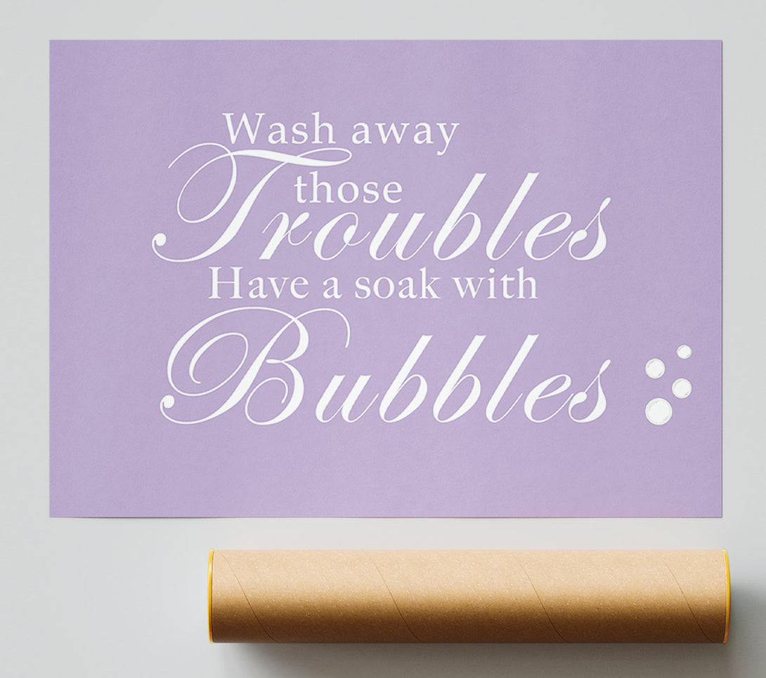Our Bathroom Quote Wash Away Those Troubles Bubbles Lilac Poster is printed 260 GSM premium lustre paper that offers vibrant colours and exceptional detail.