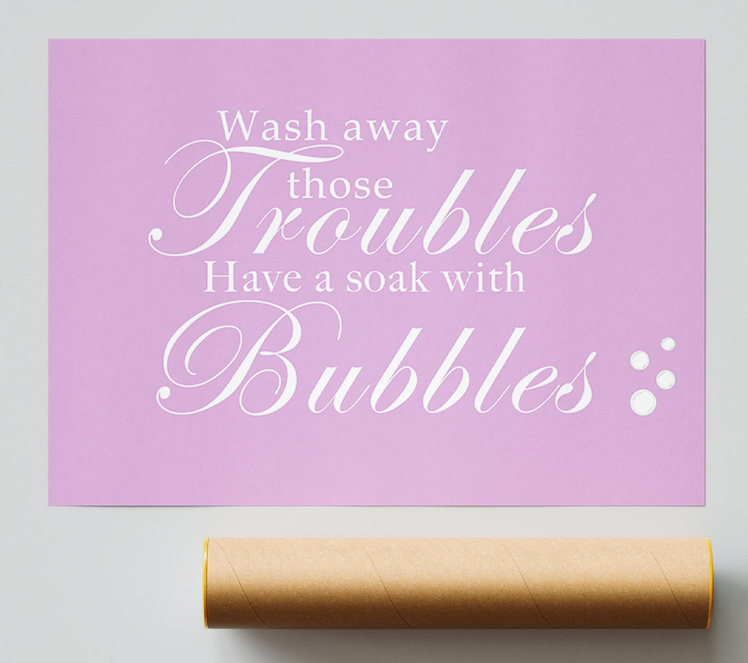 Bathroom Quote Wash Away Those Troubles Bubbles Pink Print