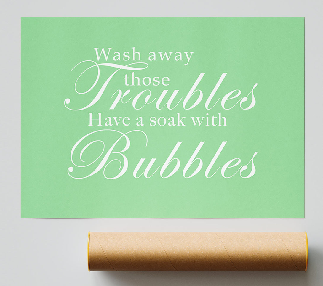 Our Bathroom Quote Wash Away Those Troubles Green Poster is printed 260 GSM premium lustre paper that offers vibrant colours and exceptional detail.