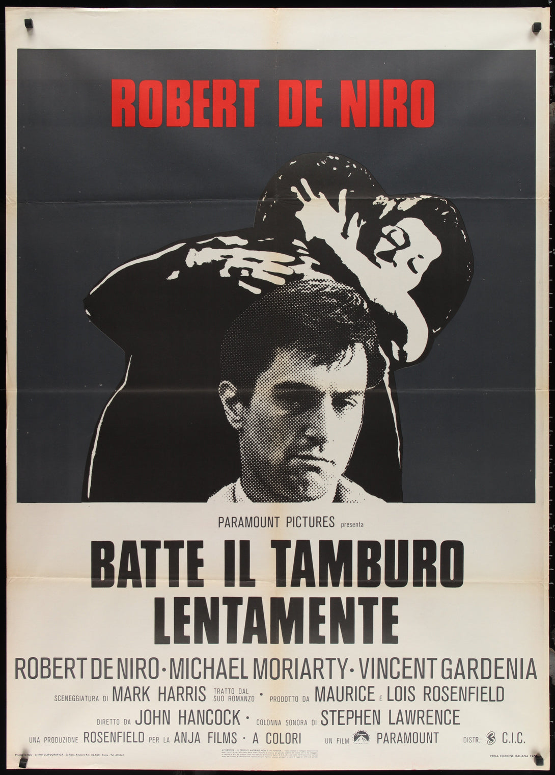 This 1977 Original Italian One-Panel Movie Poster is folded and measures 39" x 55" [99 x 140 cm]. It features the 1973 John D. Hancock baseball drama Bang the Drum Slowly, starring Robert De Niro and Michael Moriarty. The edges and folds show some wear, with discolouration along the folds and edges of the poster.