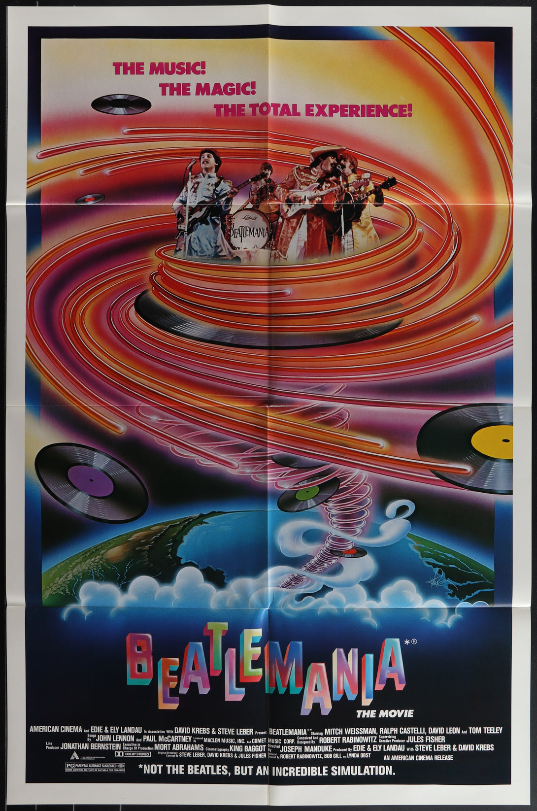 This Folded US One-Sheet Movie Poster (27" x 41") is for the 1981 Joseph Manduke-directed rock 'n' roll musical, Beatlemania: The Movie, with Mitch Weissman as Paul McCartney, Ralph Castelli as Ringo Starr, David Leon as John Lennon, Tom Teeley as George Harrison, and Christina Applegate, and includes songs by John Lennon and Paul McCartney. Minor wear on the edges and folds.