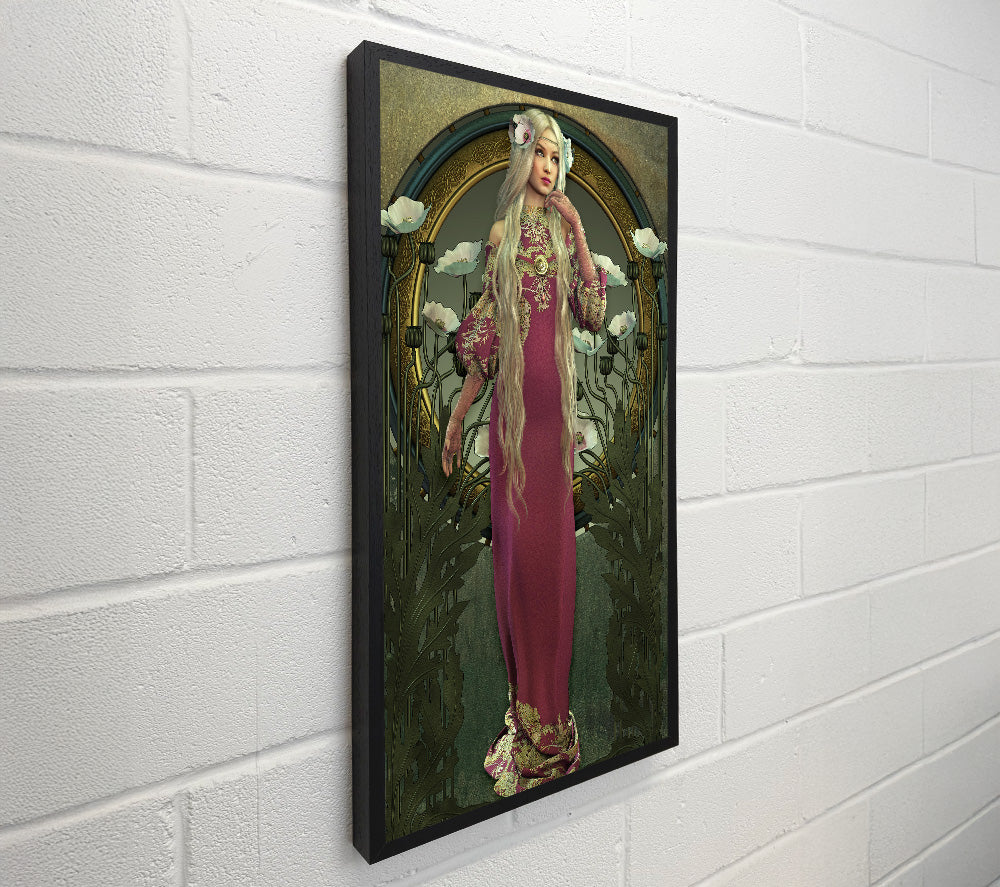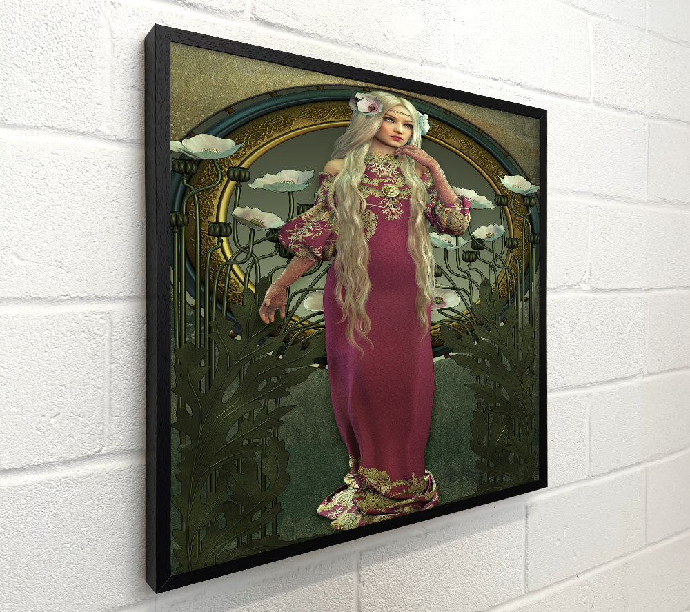 Wunderschöne quadratische Leinwand „Blumenfrau“, gedruckt auf beschichteter Polyester-Leinwand. Auf einem 44 mm großen Kastenrahmen montiert, fertig zum Aufhängen.