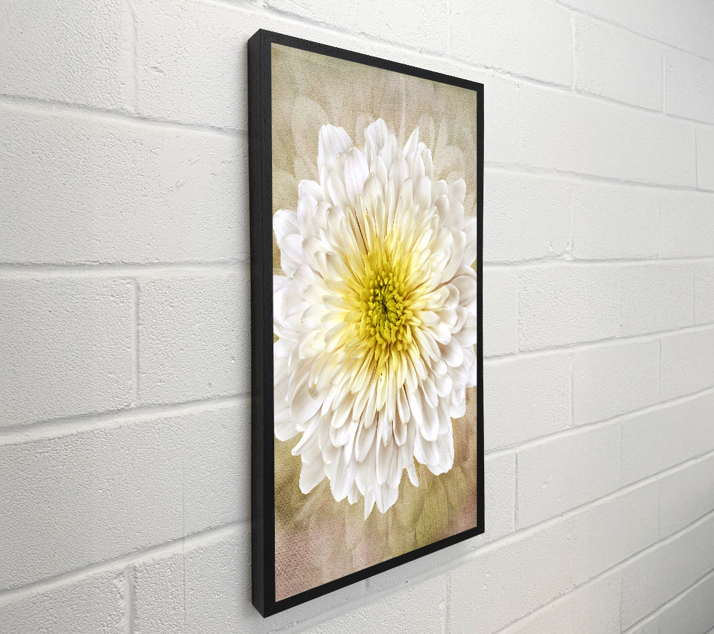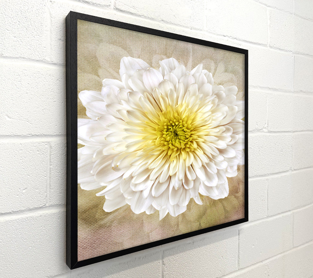 Wunderschöne quadratische Leinwand mit gelber Blume in der Mitte, gedruckt auf beschichteter Polyester-Leinwand. Auf einem 44 mm großen Kastenrahmen montiert, fertig zum Aufhängen.