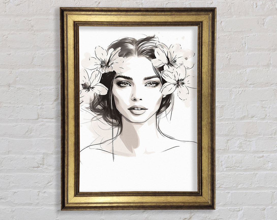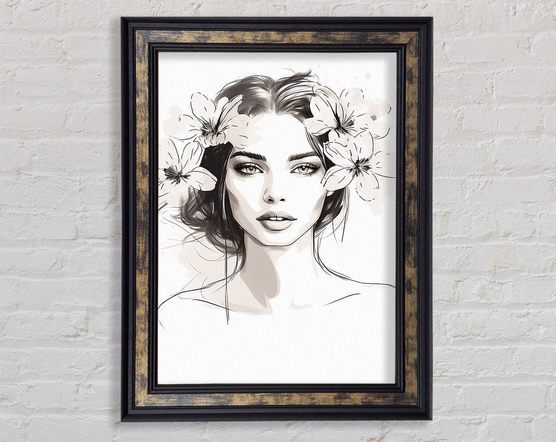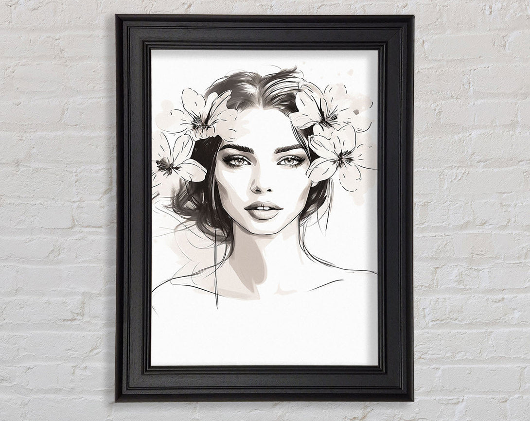 Beauty Woman Flowers Sketch Line Art Framed Print