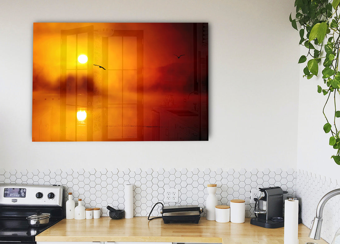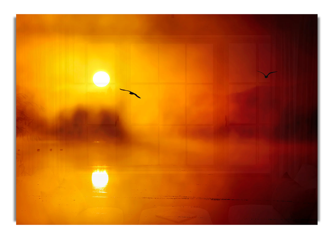 Acryldruck „Birds Over The Golden Misty Lake“, UV-Druck auf 5 mm dickes Acrylglas. Wird mit allem geliefert, was Sie zum Aufhängen an die Wand brauchen.