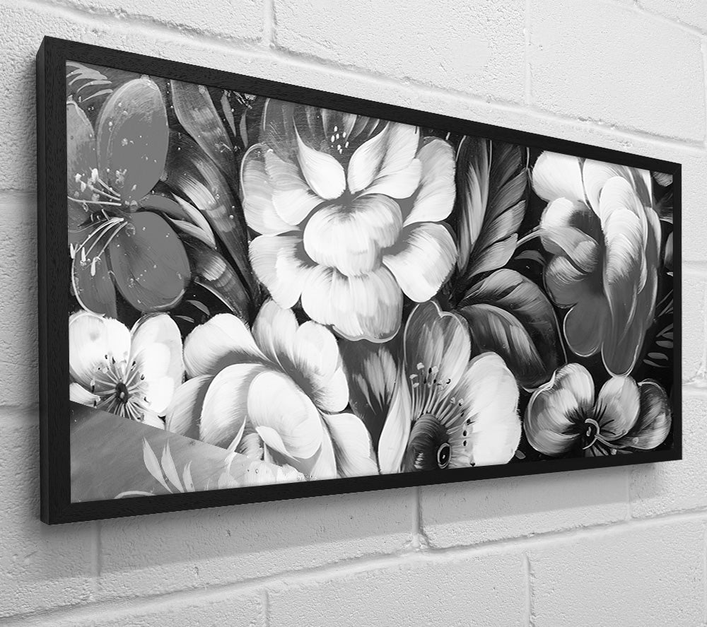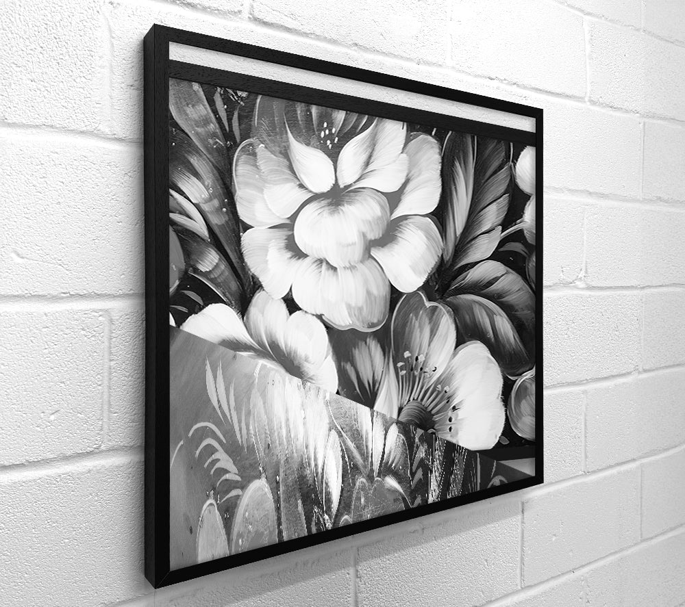 Quadratische Leinwand mit schwarzen und weißen Blumen, gedruckt auf beschichteter Polyester-Leinwand. Auf einem 44 mm großen Kastenrahmen montiert, fertig zum Aufhängen.