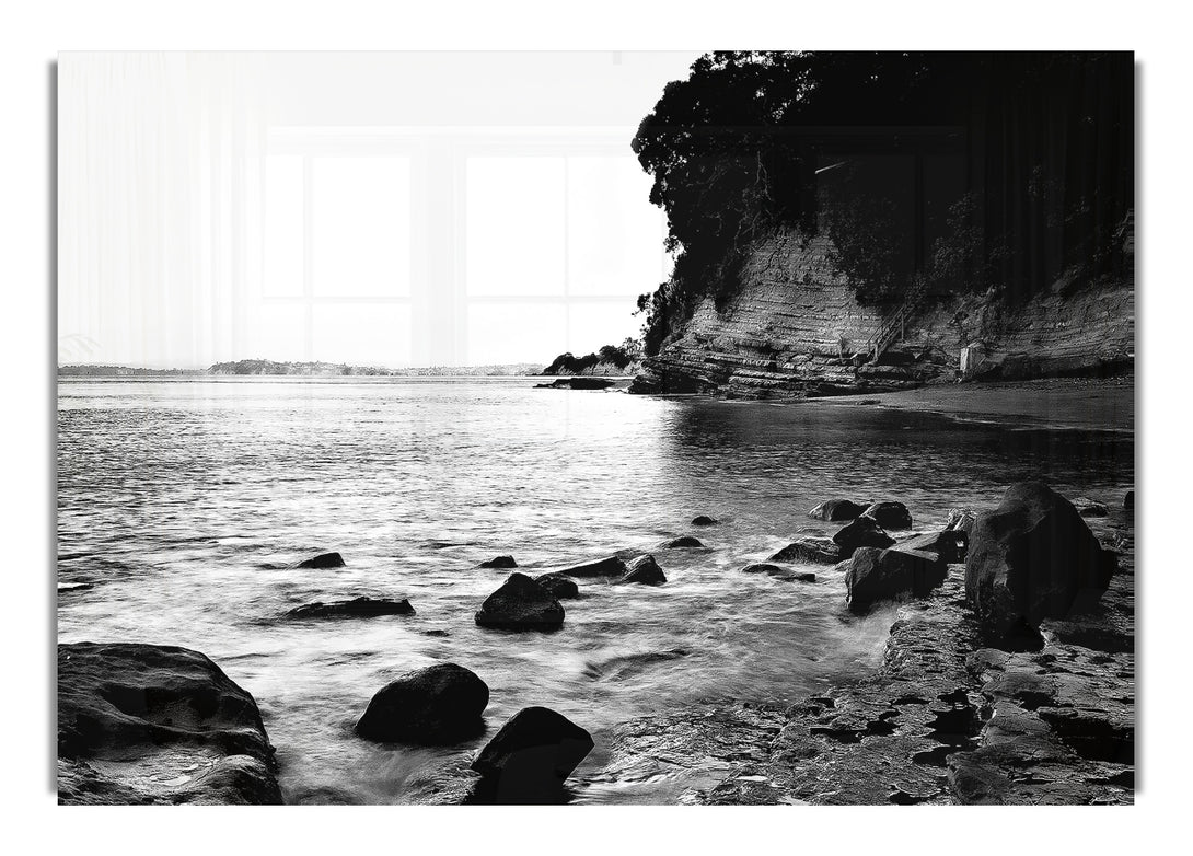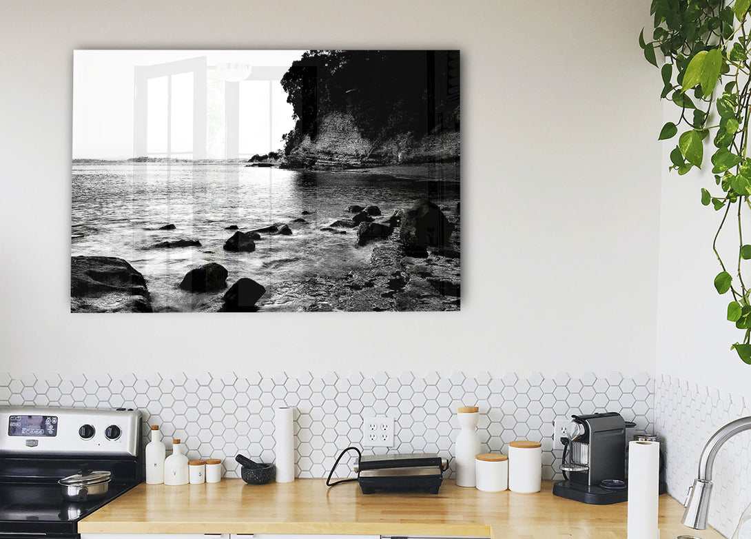 Schwarz-weißer Acryldruck „Ocean Rocks“, UV-gedruckt auf 5 mm dickes Acrylglas. Wird mit allem geliefert, was Sie zum Aufhängen an die Wand brauchen.