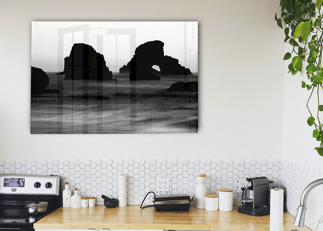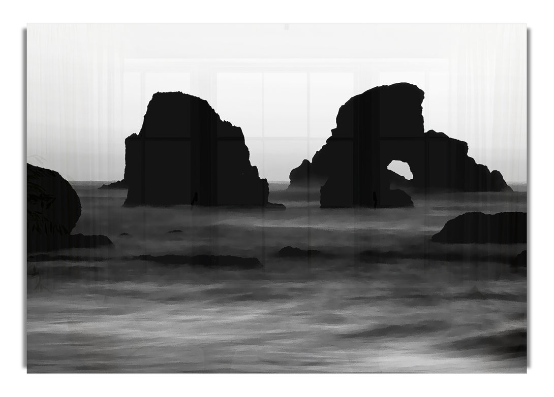 Schwarz-weißer Acryldruck „Ocean Rocks Sunset“ auf Leinwand, L, UV-gedruckt auf 5 mm dickes Acrylglas. Wird mit allem geliefert, was Sie zum Aufhängen an die Wand brauchen.