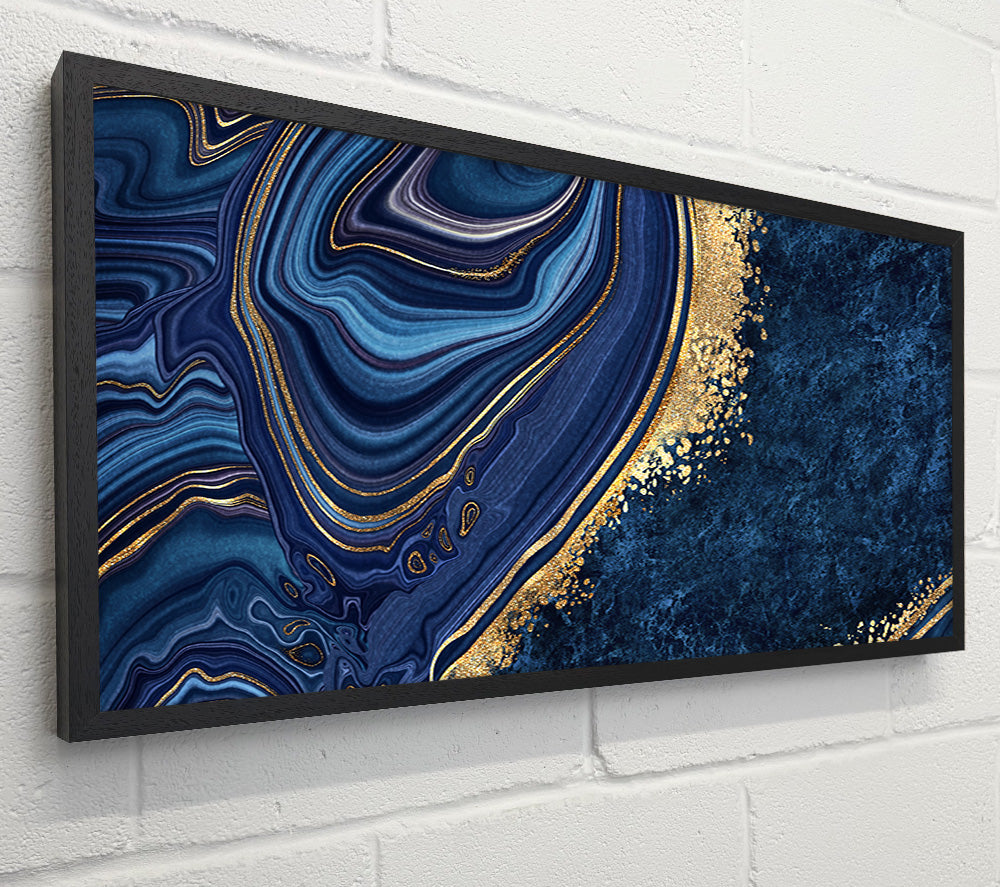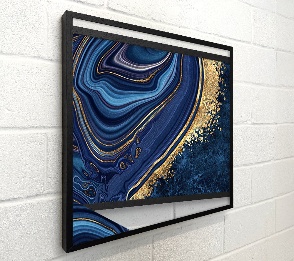 Quadratische Leinwand mit blauem und goldenem Marmor, gedruckt auf beschichteter Polyester-Leinwand. Auf einem 44 mm großen Kastenrahmen montiert, fertig zum Aufhängen.