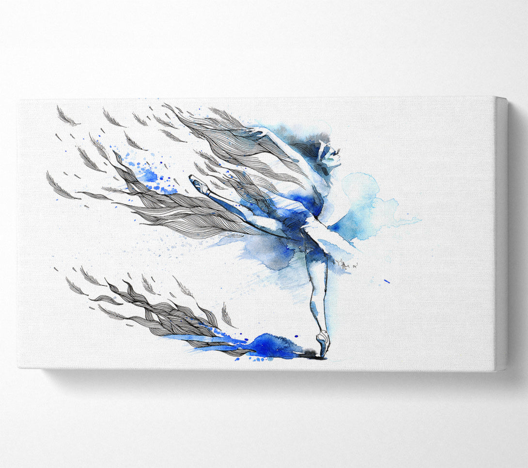 Blaue Ballerina, 12 Zoll breite Leinwand, gedruckt auf beschichteter Polyester-Leinwand. Auf einem 44 mm breiten Kastenrahmen montiert, fertig zum Aufhängen.