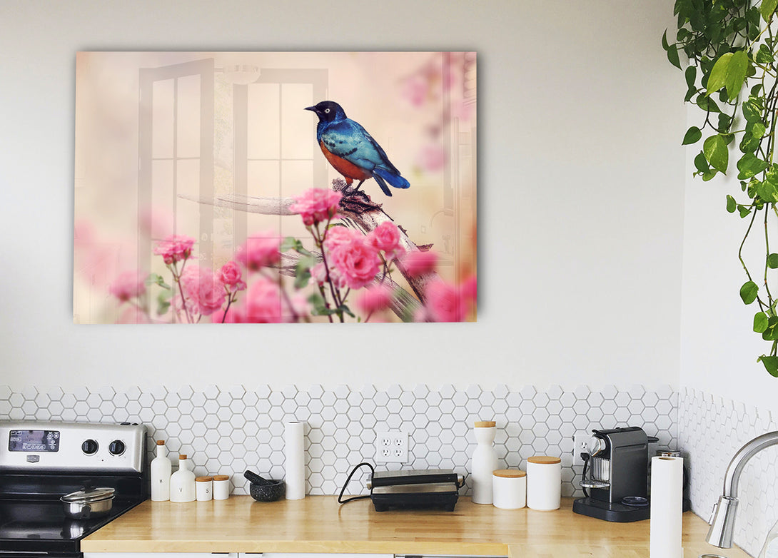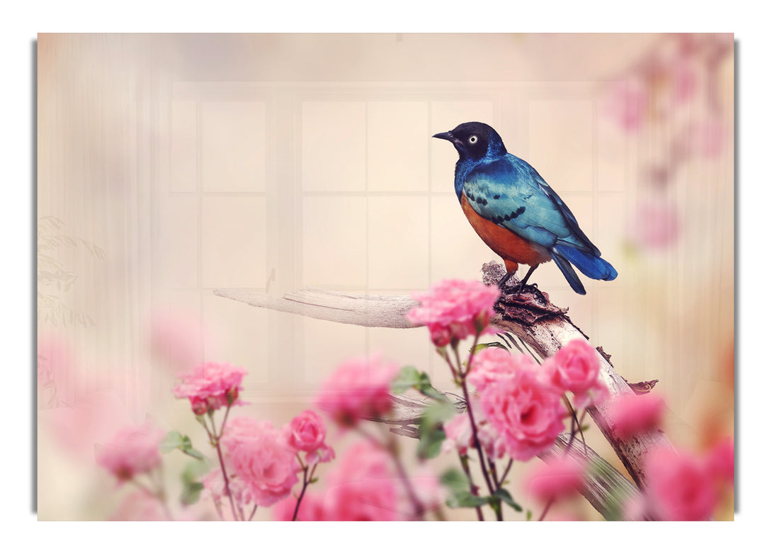 Acryldruck „Blauer Vogel in der Kirschblüte“, UV-gedruckt auf 5 mm dickes Acrylglas. Wird mit allem geliefert, was Sie zum Aufhängen an Ihre Wand benötigen.