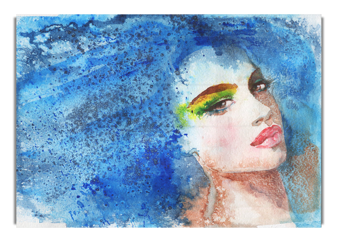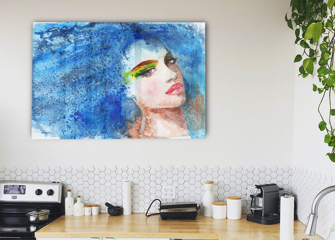 Acryldruck „Frau mit blauen Haaren“, UV-gedruckt auf 5 mm dickes Acrylglas. Wird mit allem geliefert, was Sie zum Aufhängen an die Wand brauchen.