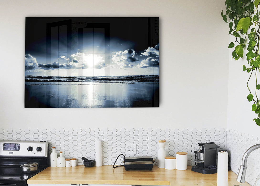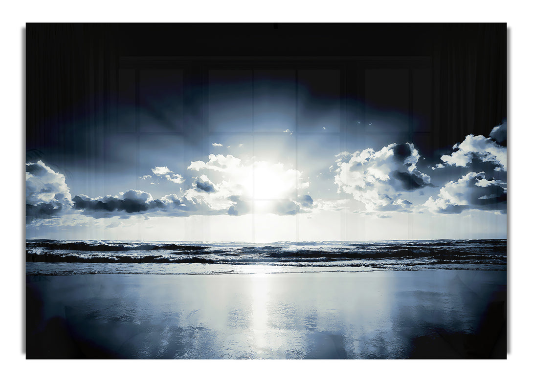Acryldruck „Blue Ocean Sunrise“, UV-gedruckt auf 5 mm dickes Acrylglas. Wird mit allem geliefert, was Sie zum Aufhängen an die Wand brauchen.