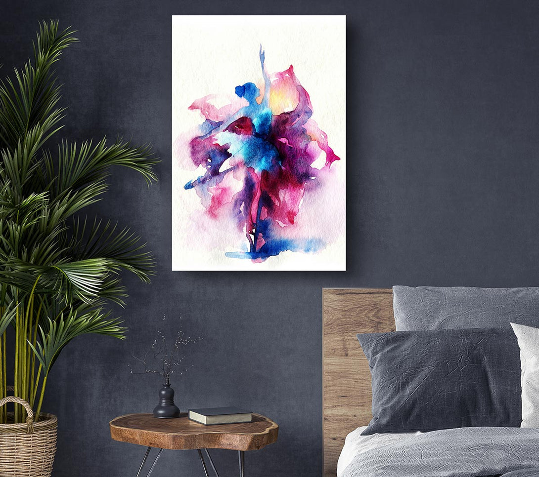 Leinwandbild „Blau-rosa Ballerina 7“, gedruckt auf beschichteter Polyester-Leinwand. Auf einem 44 mm großen Kastenrahmen montiert, fertig zum Aufhängen.