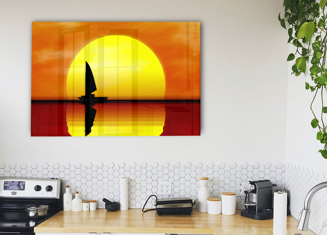 Acryldruck „Boot segelt im Sonnenuntergang“, UV-Druck auf 5 mm dickes Acrylglas. Wird mit allem geliefert, was Sie zum Aufhängen an die Wand brauchen.