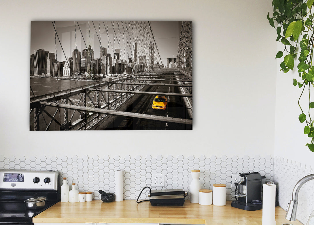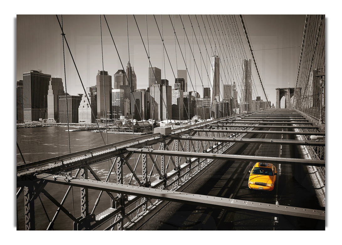 Acryldruck „Brooklyn Bridge Yellow Cab Leaving NYC“, UV-gedruckt auf 5 mm dickes Acrylglas. Wird mit allem geliefert, was Sie zum Aufhängen an die Wand brauchen.