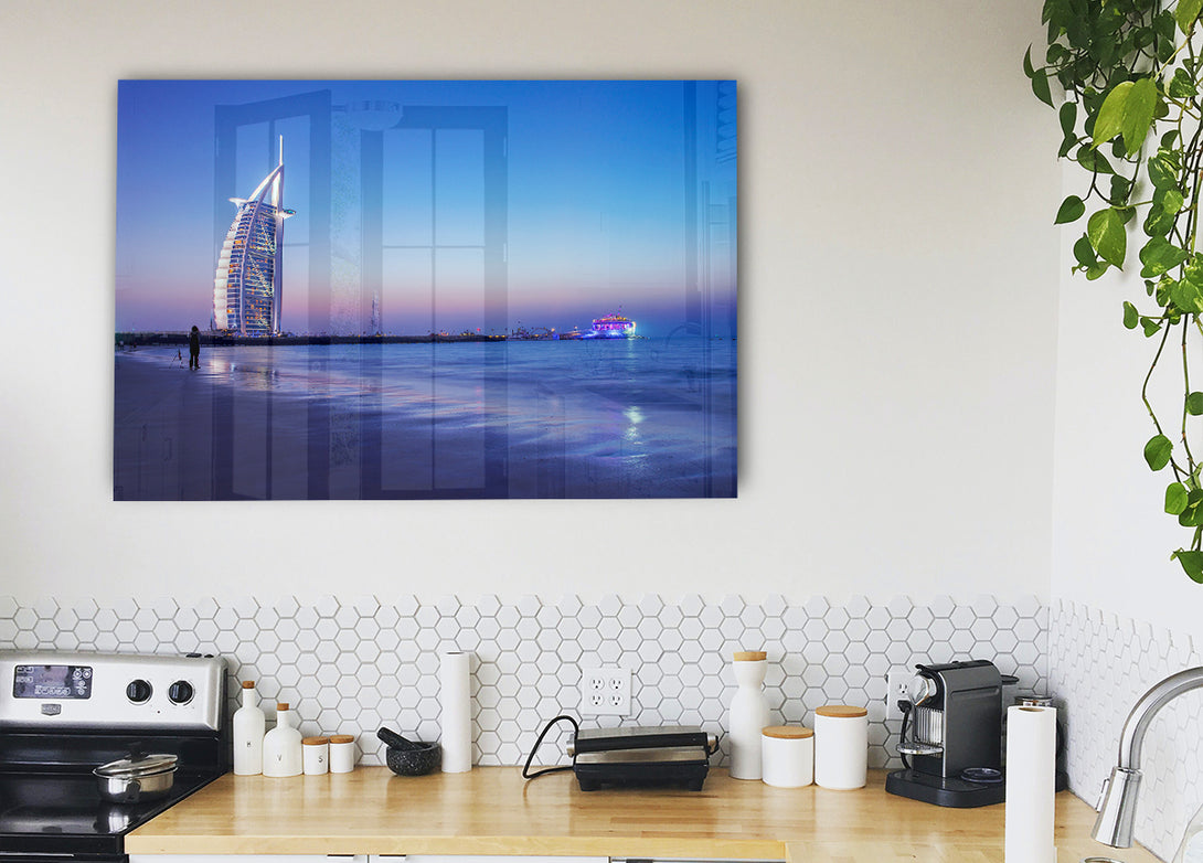 Acryldruck des 7-Sterne-Hotels Burj Al Arab, UV-Druck auf 5 mm dickes Acrylglas. Wird mit allem geliefert, was Sie zum Aufhängen an die Wand benötigen.