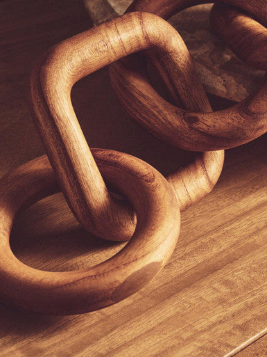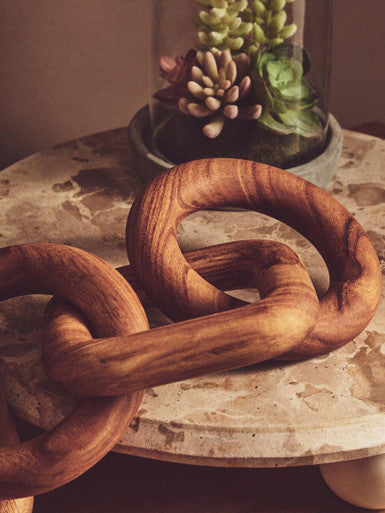 The five-link decorative chain features a captivating arrangement of circular and square links, creating a dynamic and continuous flow. Handcrafted from natural wood by skilled artisans, this sculptural chain boasts an intertwined form and organic texture and variations, making it ideal for coffee table styling. *Please note that naturally occurring variations may occur in wood colour, texture and grain.