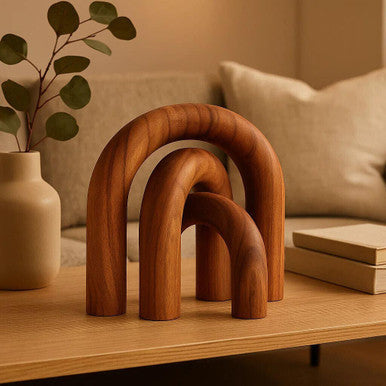 This Cato sculpture is handcrafted by skilled artisans from natural wood, featuring three distinct arch shapes of varying sizes. The smooth curves form a visually appealing and dynamic décor piece, ideal for coffee table styling. The warm tones and natural grain of the wood add an organic element to its modern design. *Please note that naturally occurring variations may occur in wood colour, texture and grain.