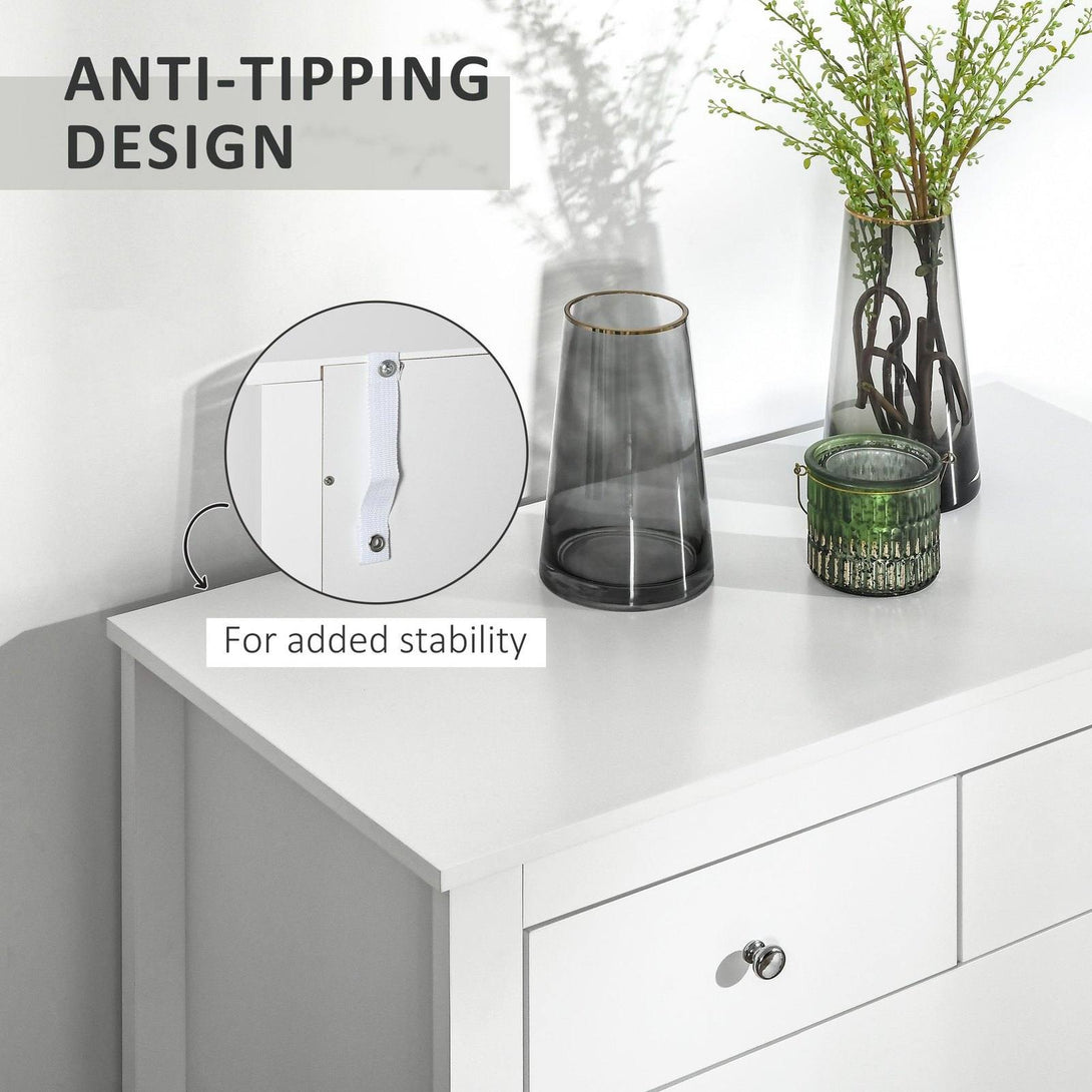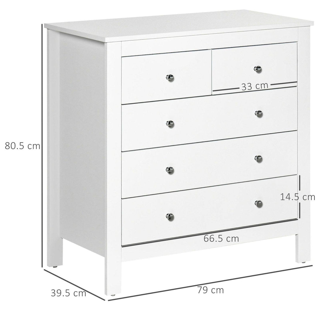 Fresh, spacious and simple, this HOMCOM chest of draws is the perfect addition to any living space. Made from a hard wearing engineered wood, the bedroom drawers are built to last, with a smooth painted surface for easy maintenance. Featuring three large drawers and two smaller top drawers, this drawer unit offers plenty of space for storage to keep your home easily clean and organised and is finished with feet to elevate it and stop any wear and tear.