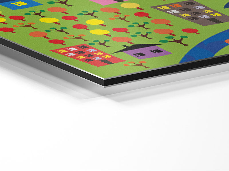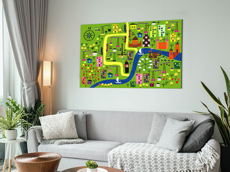 Kinderstadtplan, gedruckt auf gebürstetem Aluminium-Dibond. Eine moderne Art, Kunst zu präsentieren und leicht zu pflegen.