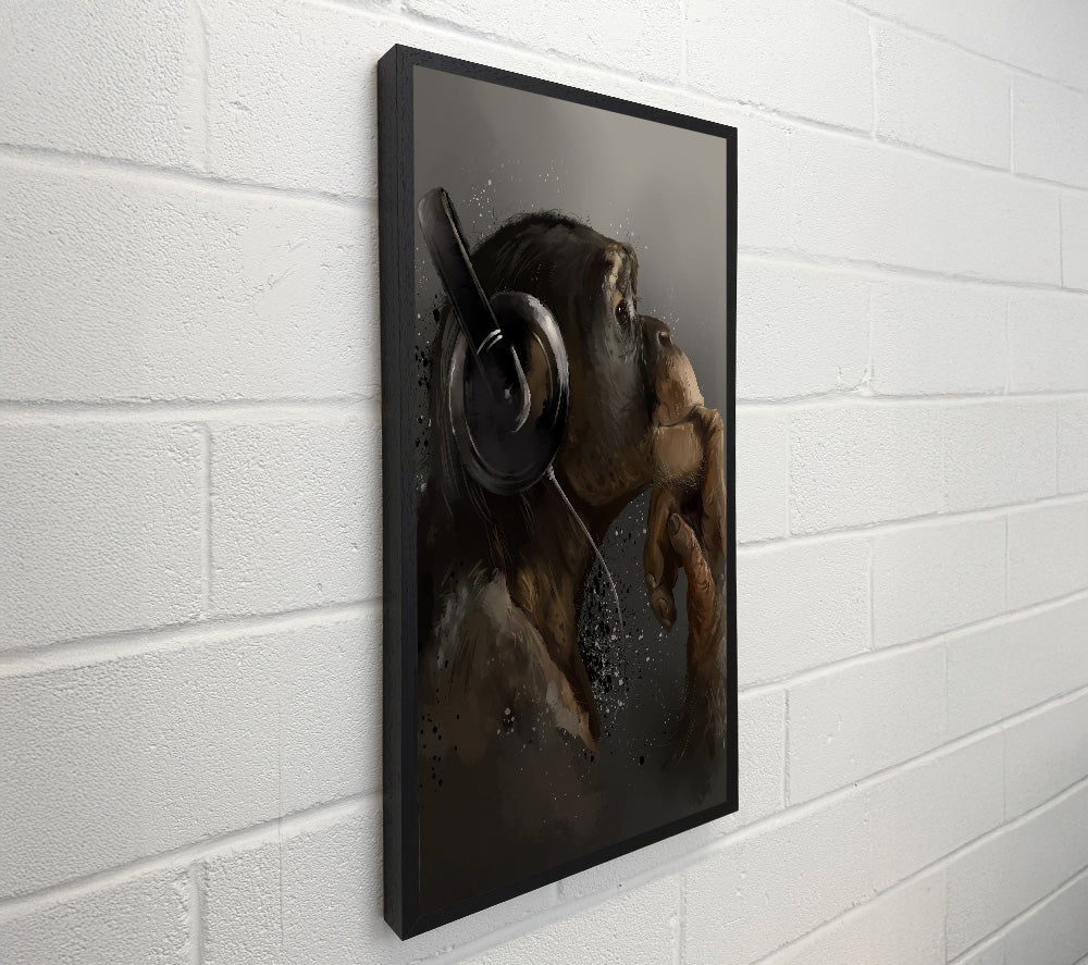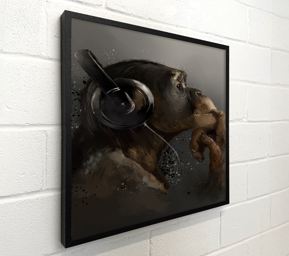 Chimpanzee Dj quadratische Leinwand, gedruckt auf beschichteter Polyester-Leinwand. Auf einem 44 mm großen Kastenrahmen montiert, fertig zum Aufhängen.