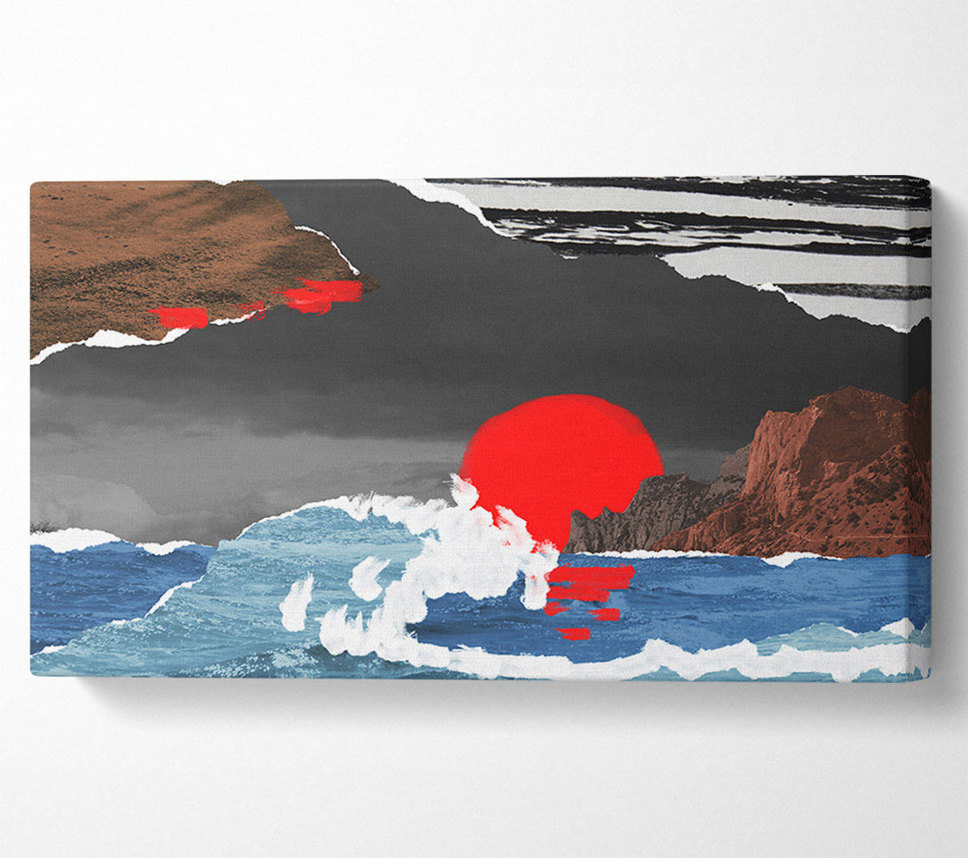 Ausgeschnittene Leinwand „Mountain Ocean Red Sun“, gedruckt auf beschichteter Polyester-Leinwand. Auf einem 44 mm großen Kastenrahmen montiert, fertig zum Aufhängen.