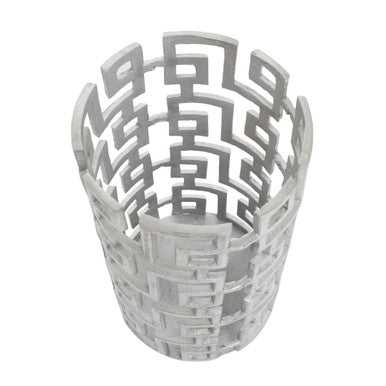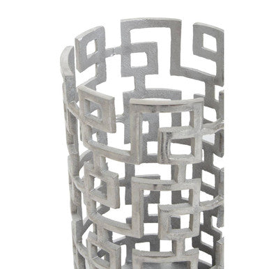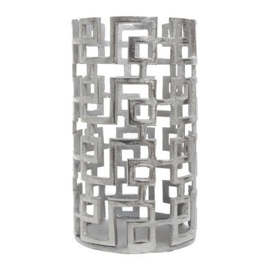 The distinctive design of this candle holder goes well with a contemporary home. This holder is intricately handcrafted from robust aluminium and given a silver finish that exudes radiance, and the cut-out design creates an art deco allure.