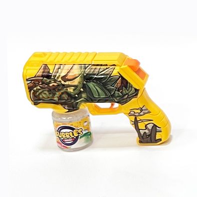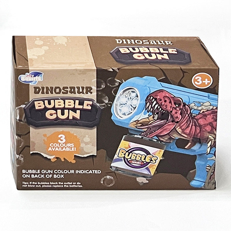 This bubble gun toy fires a flurry of bubbles and even lights up! With a cool dinosaur theme, it's super fun for young children! Powered by 4x AA batteries (available separately).Approximate product dimensions: (H) 14cm x (W) 6cm x (D) 18cmPlease note: lifestyle photographs for illustration, 1x product listed supplied only. Colours and designs may be updated or vary slightly. Please read all packaging and instructions thoroughly before use.Not suitable for children under 36 months old - choking hazard due to small parts.