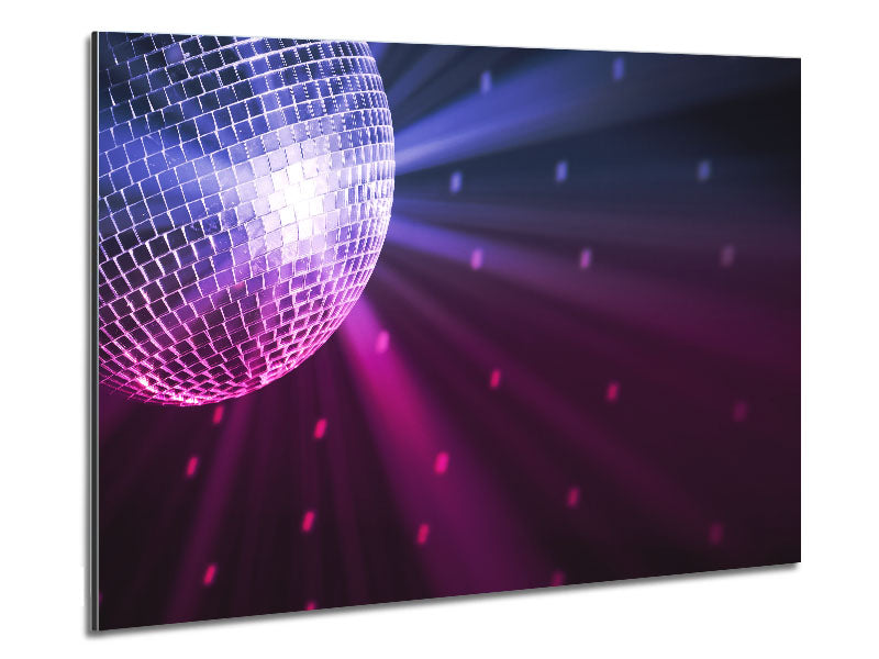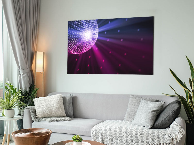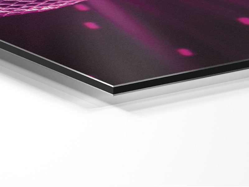 Diskokugel blau und pink Gedruckt auf gebürstetem Aluminium-Dibond. Eine moderne Art, Kunst zu präsentieren und leicht zu pflegen.