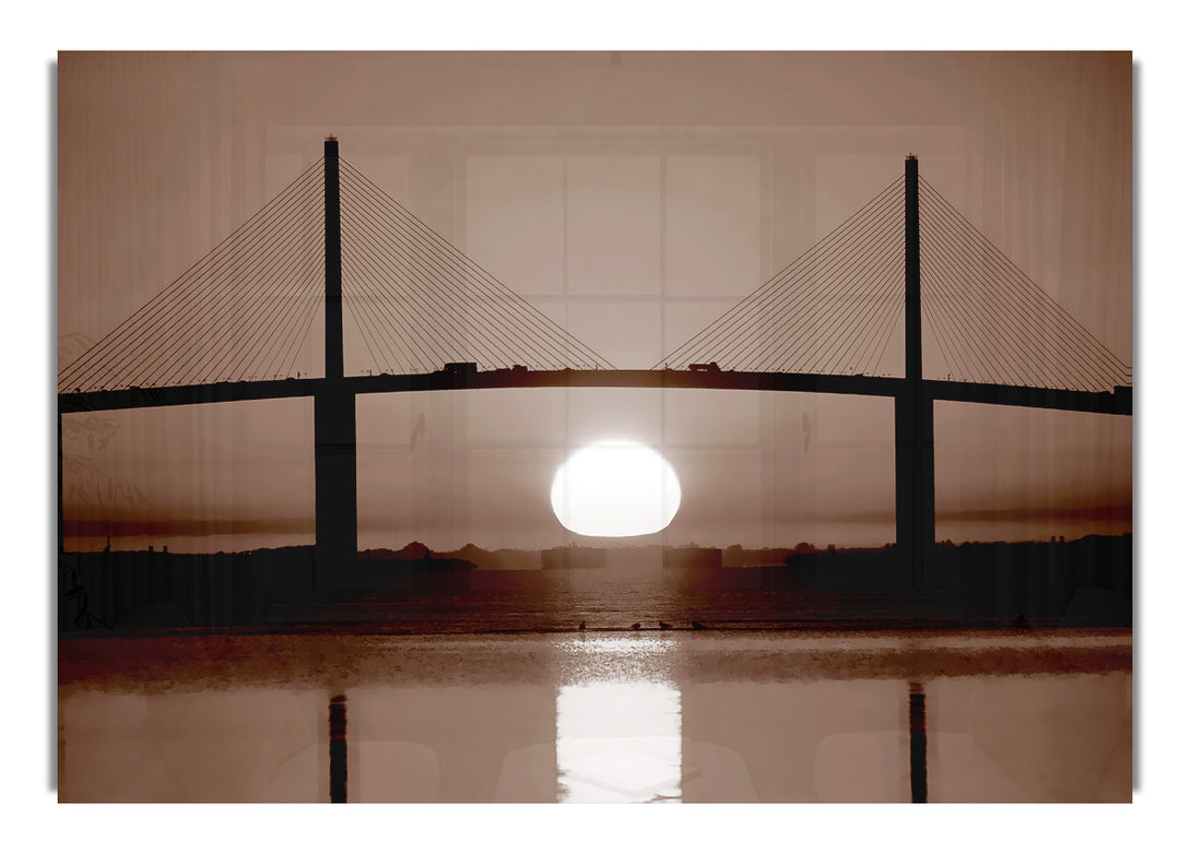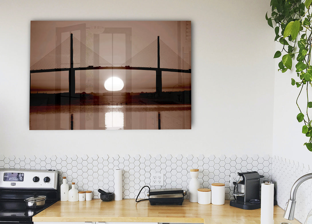 Distant Bridge Sundown Chocolate-Acryldruck, UV-gedruckt auf 5 mm dickes Acrylglas. Wird mit allem geliefert, was Sie zum Aufhängen an die Wand brauchen.