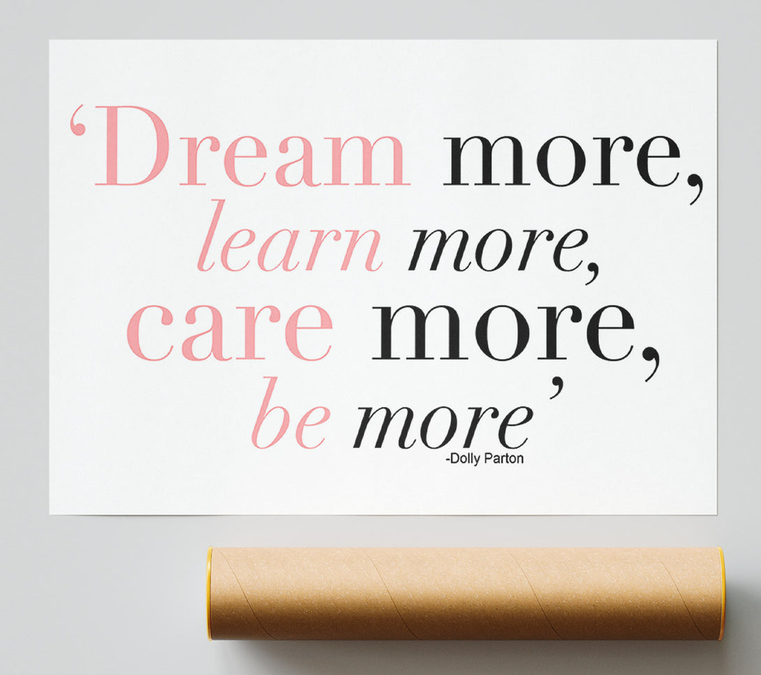 Our Dolly Parton Dream More Be More Poster is printed 260 GSM premium lustre paper that offers vibrant colours and exceptional detail.