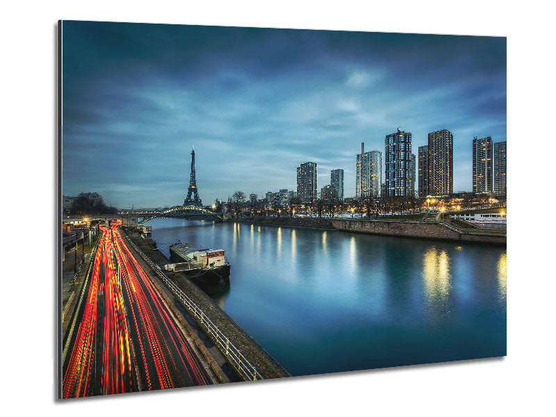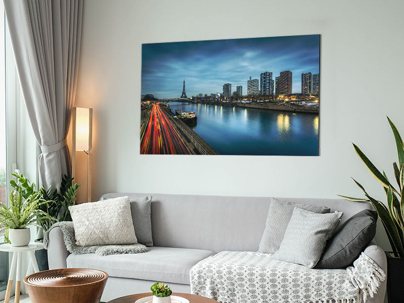 Eiffelturm über der Seine 1 Gedruckt auf gebürstetem Aluminium-Dibond. Eine moderne Art, Kunst zu präsentieren und leicht zu pflegen.