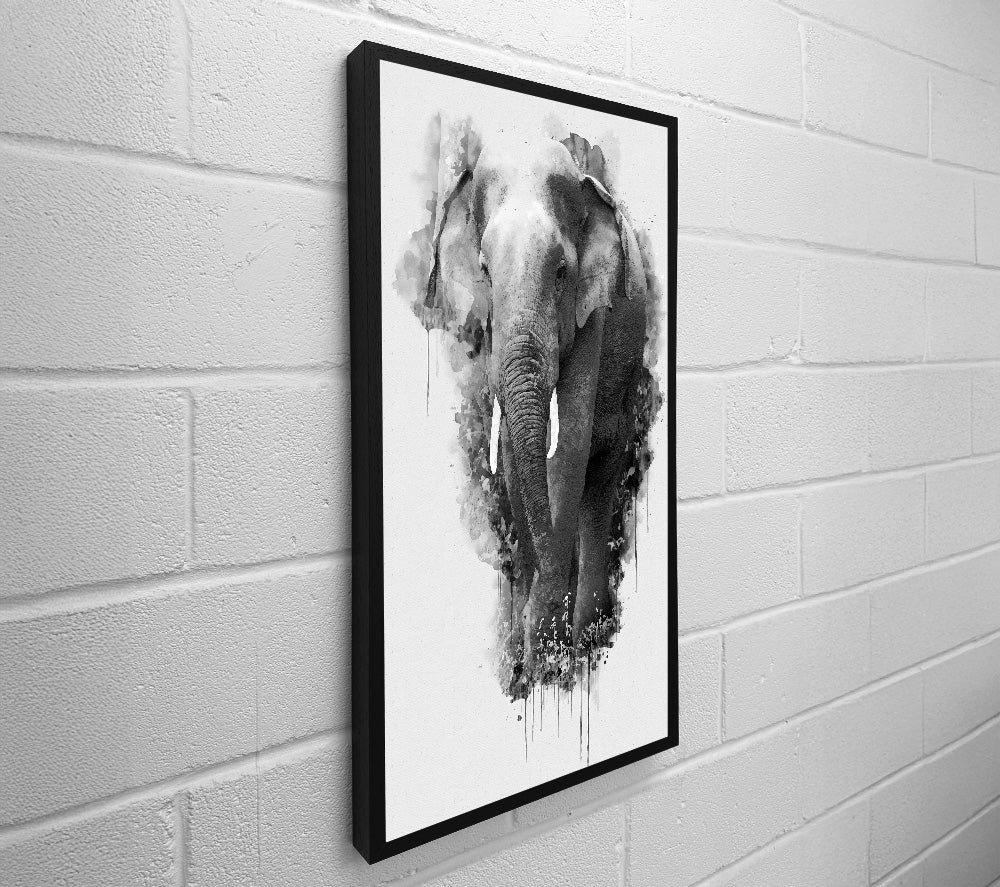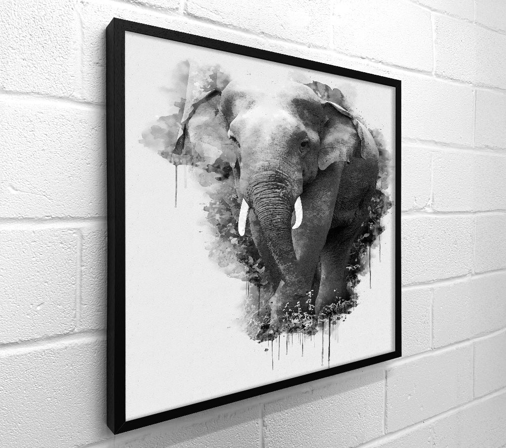 Elephant Splash Watercolor, quadratische Leinwand, gedruckt auf beschichteter Polyester-Leinwand. Auf einem 44 mm großen Kastenrahmen montiert, fertig zum Aufhängen.