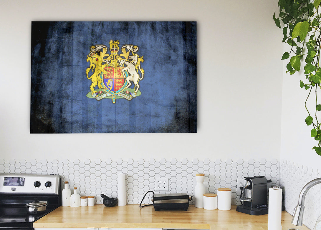 Acryldruck mit englischem Wappen, UV-Druck auf 5 mm dickes Acrylglas. Wird mit allem geliefert, was Sie zum Aufhängen an die Wand benötigen.