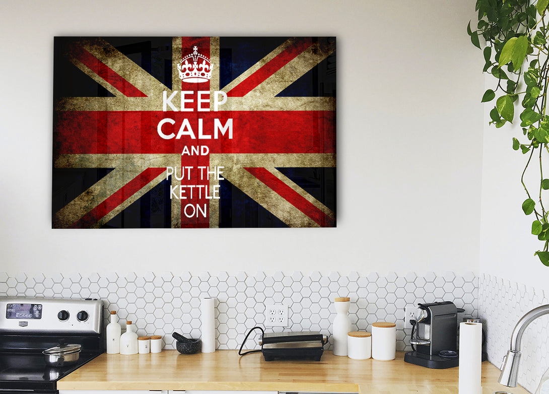 Acryldruck „Keep Calm“ mit englischer Flagge, UV-Druck auf 5 mm dickes Acrylglas. Wird mit allem geliefert, was Sie zum Aufhängen an die Wand brauchen.