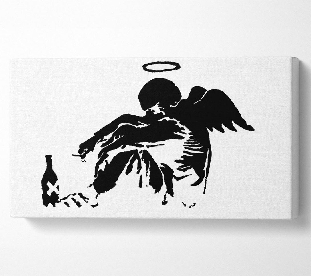Schwarz-weiße Leinwand mit dem Motiv „Fallen Angel“, gedruckt auf beschichteter Polyester-Leinwand. Auf einem 44 mm großen Kastenrahmen montiert, fertig zum Aufhängen.