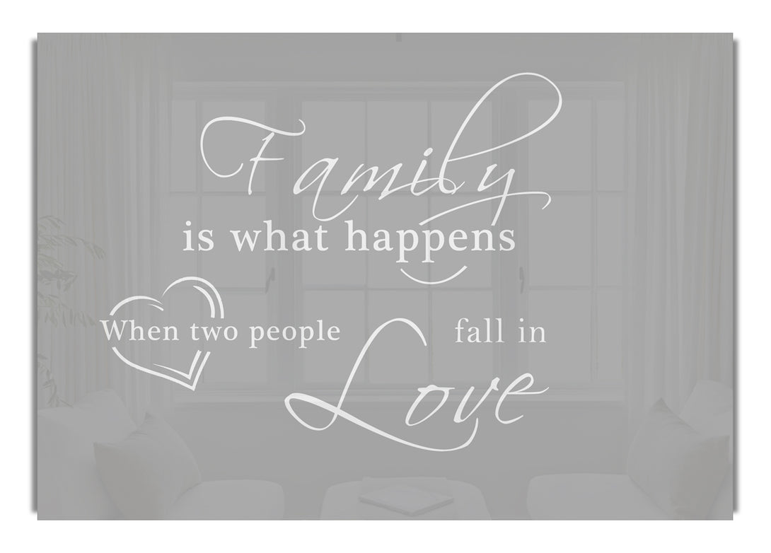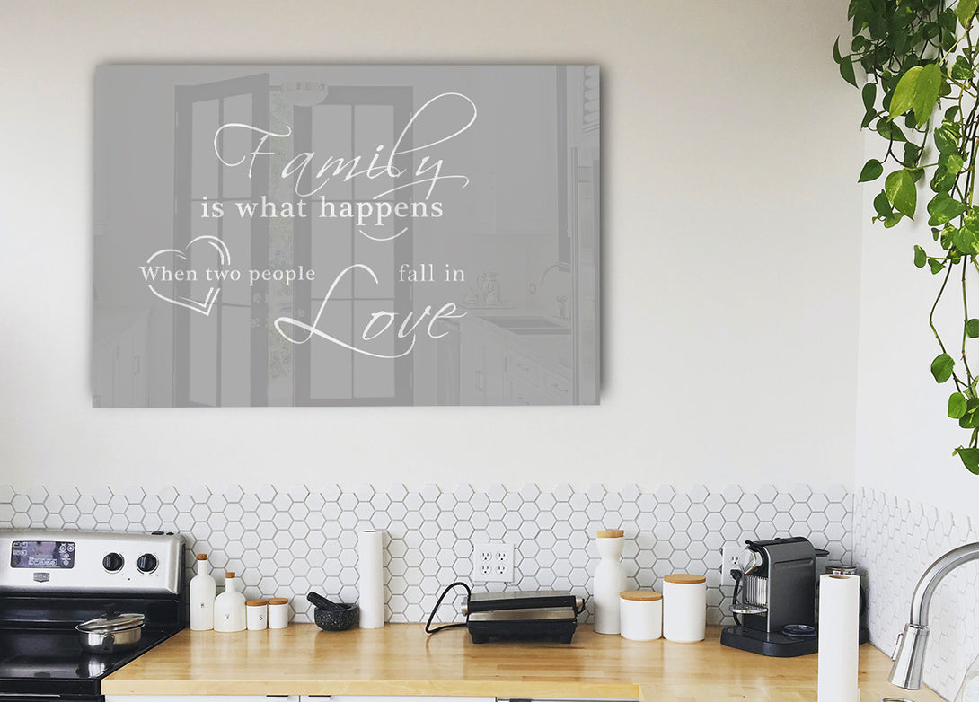 Family Is What Happens, grauweißer Acryldruck, UV-gedruckt auf 5 mm dickes Acrylglas. Wird mit allem geliefert, was Sie zum Aufhängen an die Wand brauchen.