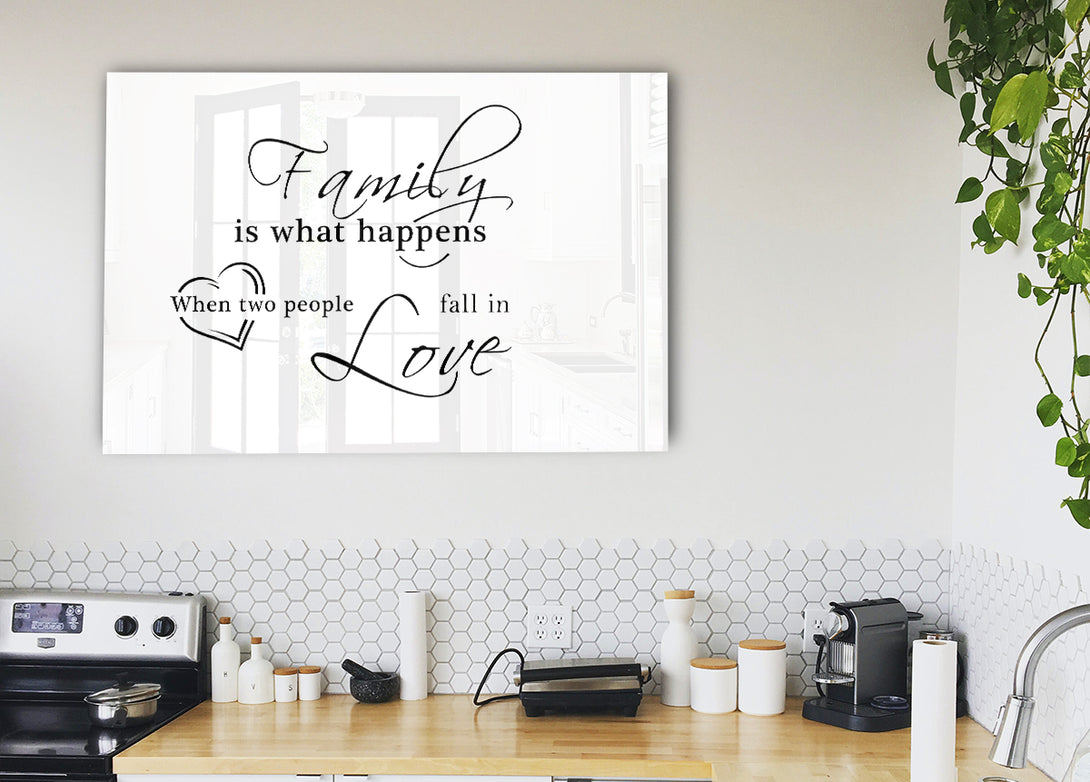 Family Is What Happens Weißer Acryldruck, UV-gedruckt auf 5 mm dickes Acrylglas. Wird mit allem geliefert, was Sie zum Aufhängen an die Wand brauchen.