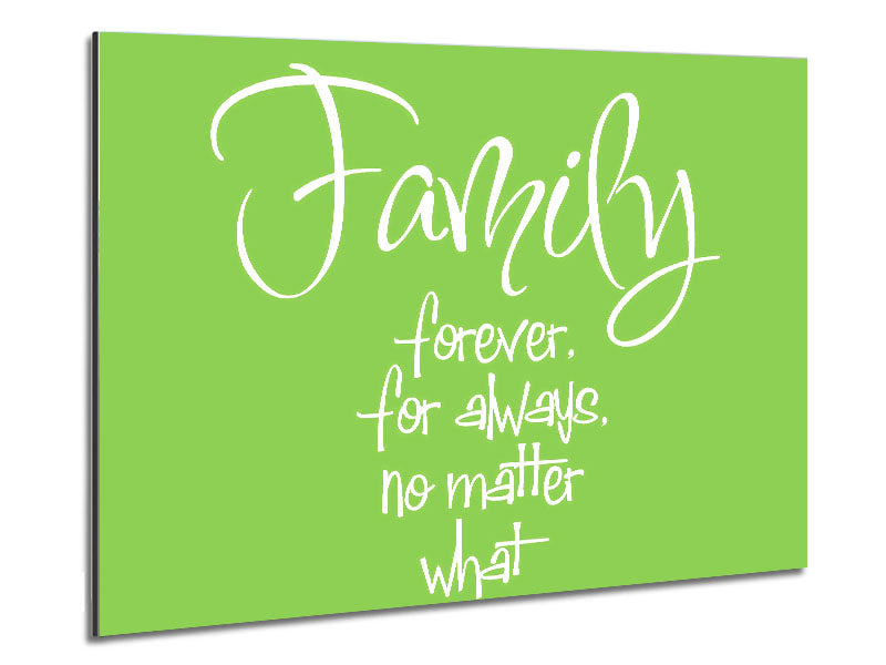 Familienzitat „Family Forever For Always“ in Limettengrün. Gedruckt auf gebürstetem Aluminium-Dibond. Eine moderne Art, Kunst zu präsentieren und leicht zu pflegen.