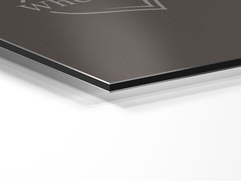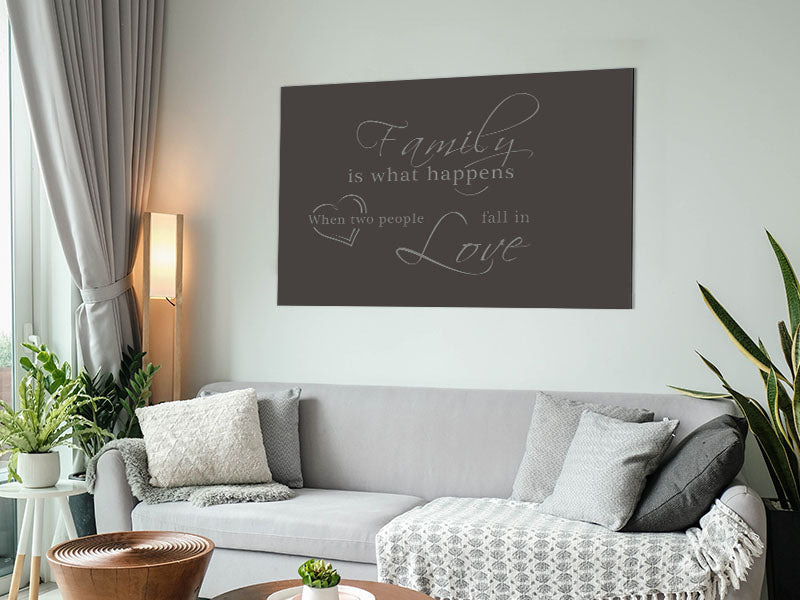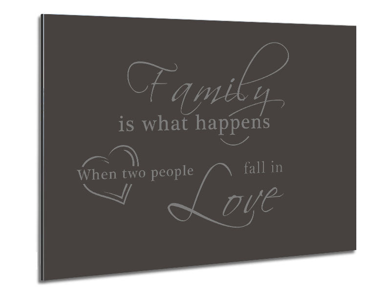 Familienzitat „Familie ist, was passiert“ – Schokolade. Gedruckt auf gebürstetem Aluminium-Dibond. Eine moderne Art, Kunst zu präsentieren und leicht zu pflegen.