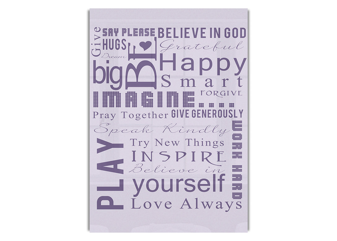 Familienregeln: Sei glücklich, liebe immer. Lila Acryldruck, UV-gedruckt auf 5 mm dickes Acrylglas. Wird mit allem geliefert, was Sie zum Aufhängen an die Wand brauchen.