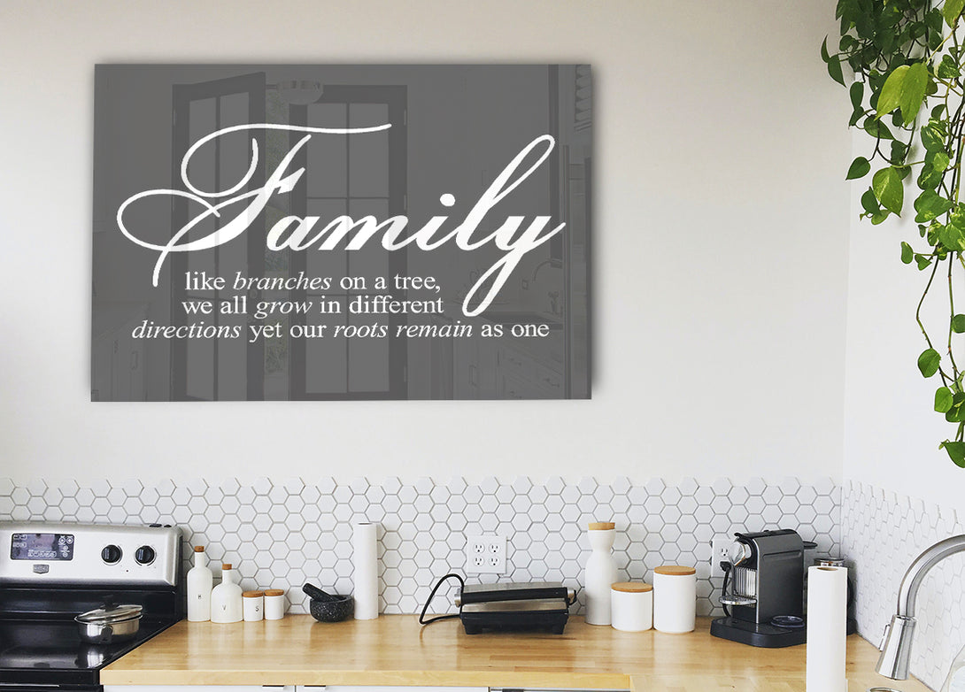 Familie, wir wachsen alle in unterschiedliche Richtungen. Grauer Acryldruck, UV-gedruckt auf 5 mm dickes Acrylglas. Wird mit allem geliefert, was Sie zum Aufhängen an Ihre Wand brauchen.