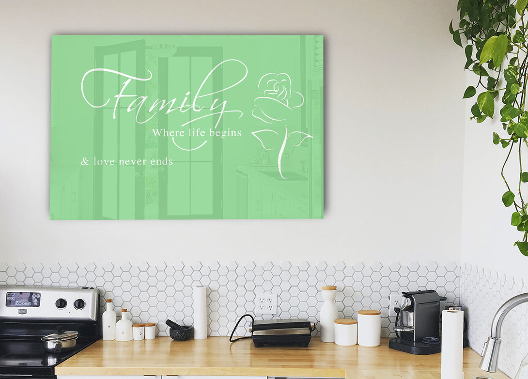 Familie, wo das Leben beginnt 1 Grüner Acryldruck, UV-gedruckt auf 5 mm dickes Acrylglas. Wird mit allem geliefert, was Sie zum Aufhängen an die Wand brauchen.