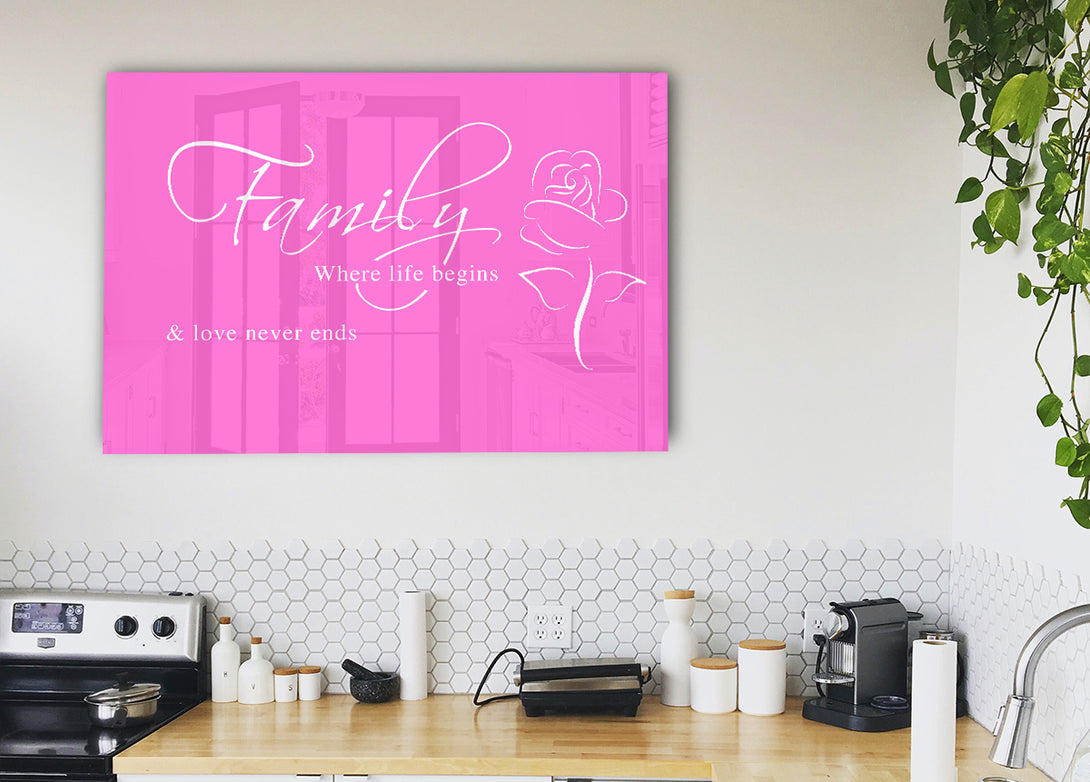 Family Where Life Begins 1 Acryldruck in leuchtendem Pink, UV-gedruckt auf 5 mm dickes Acrylglas. Wird mit allem geliefert, was Sie zum Aufhängen an die Wand brauchen.