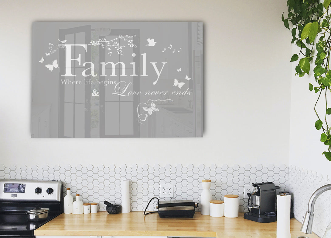 Familie, wo das Leben beginnt, grauweißer Acryldruck, UV-gedruckt auf 5 mm dickes Acrylglas. Wird mit allem geliefert, was Sie zum Aufhängen an die Wand brauchen.
