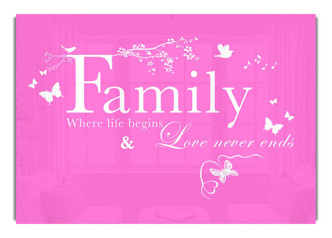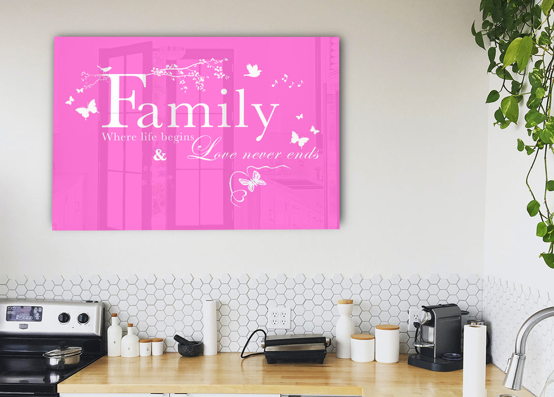 Family Where Life Begins Acryldruck in leuchtendem Pink, UV-gedruckt auf 5 mm dickes Acrylglas. Wird mit allem geliefert, was Sie zum Aufhängen an die Wand brauchen.
