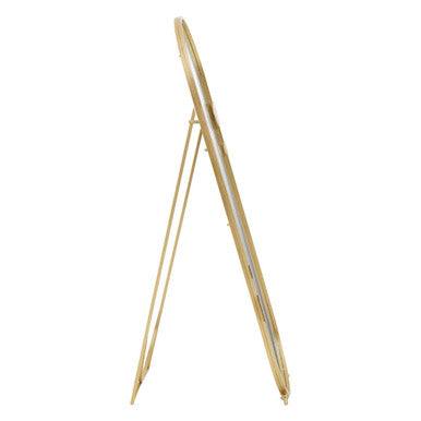 The Farran pill-shaped floor standing mirror has a sleek and sturdy metal frame in the warm metallic finish. The frame furthers the sophistication with multisized circles detail. An adjustable easel back gives the mirror firm support and keep it in place.