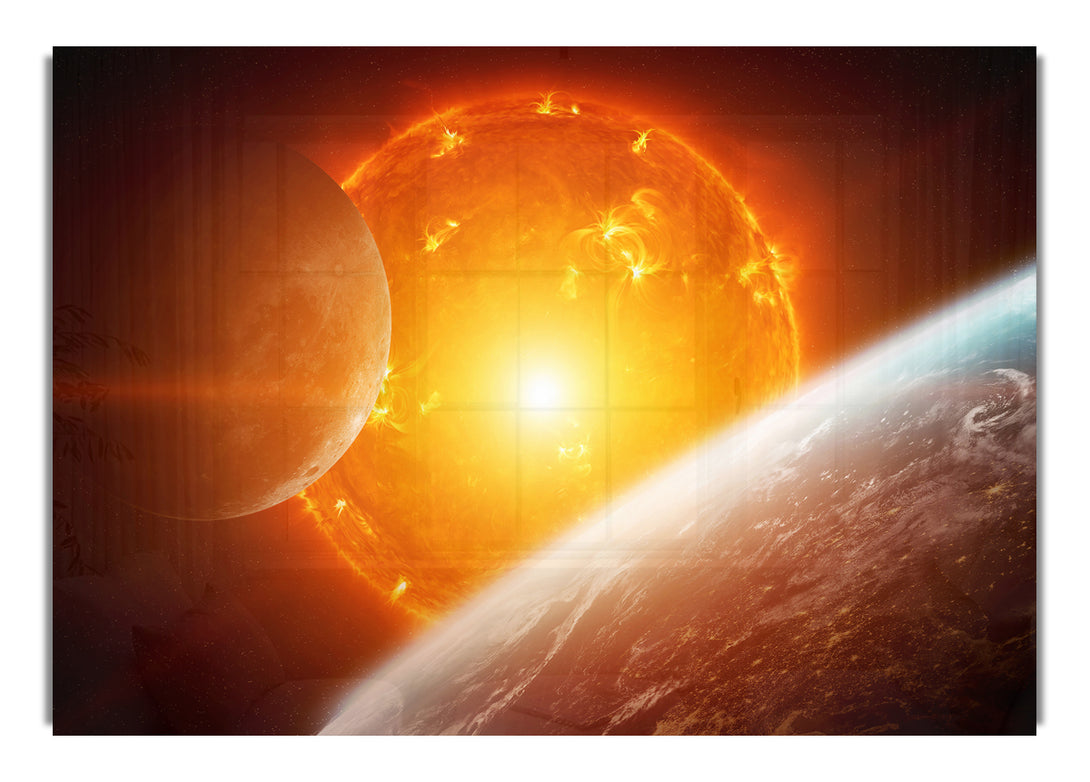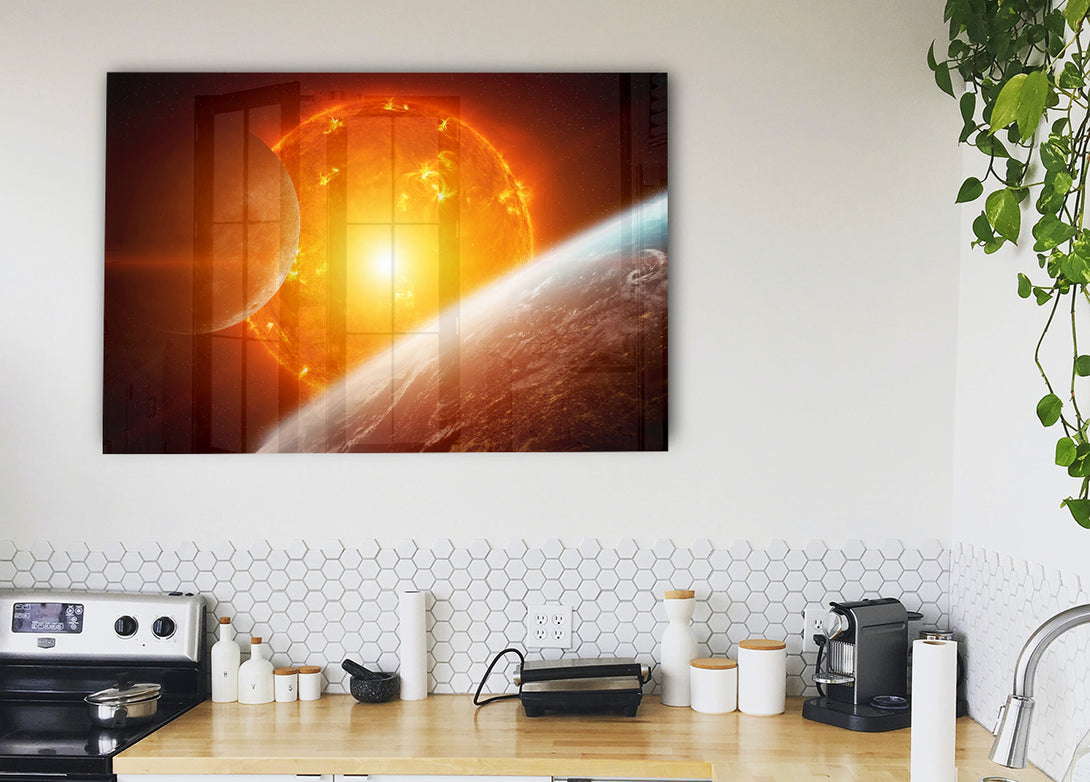 Acryldruck „Fire Sun 3“, UV-Druck auf 5 mm dickes Acrylglas. Wird mit allem geliefert, was Sie zum Aufhängen an die Wand benötigen.